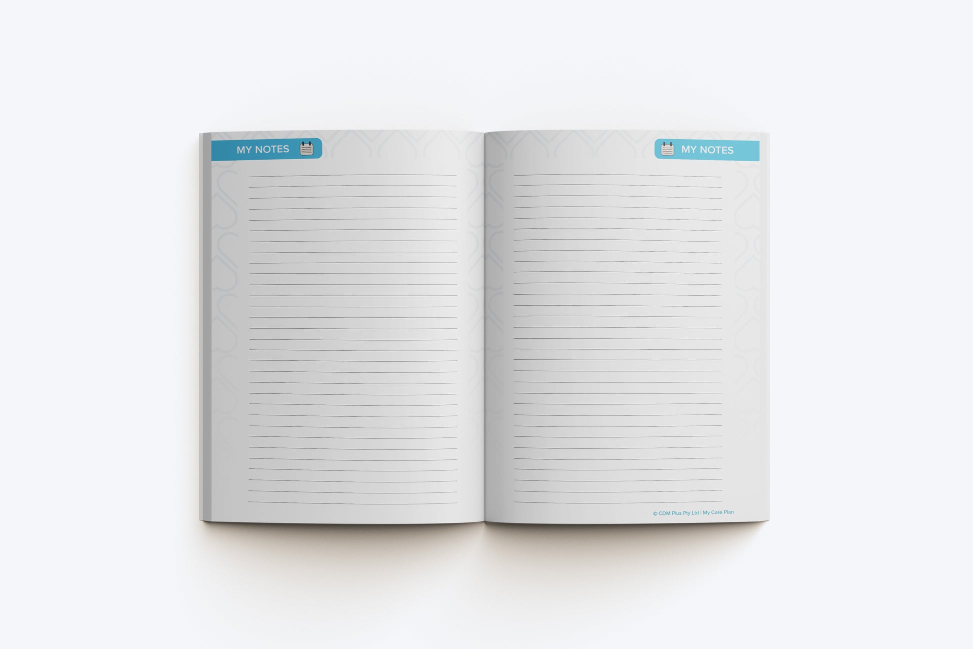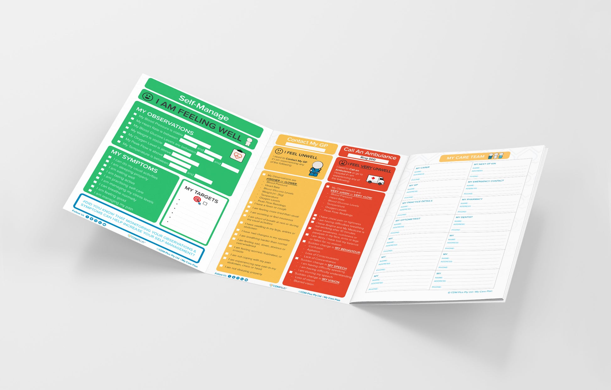 • My Care Plan – Chronic Care Booklet is an A4, 80-page, 12-month customisable health planner that includes set-up instructions to help you self-manage your chronic condition. The booklet allows you to record your Care TeamHealth HistoryFamily HistoryMedicines, and Immunisations. Your Self-Management sections allow you to map your Annual PlanMonthly Plan, and Set Goals.  Your Monthly Plan lets you set GoalsTasks, and keep consistent with a daily Habit Tracker.  Depending on your chronic condition you may need to keep track of certain Observations like your Blood Pressure.  The Observations double page lets you record Blood Pressure, Heart Rate, Temperature, Weight, Activities, Active Minutes, Blood Glucose Levels, Oxygen Saturation, Peak Flow, and Fluid Intake.  There is a Notes double page each month so you can keep a timeline of your health and visits to other providers.  Your Escalation Protocol is a traffic light system, so you know when you are on Target (Green), when you need to contact your GP (Yellow) or when you need to Call an Ambulance or go to Hospital (Red).